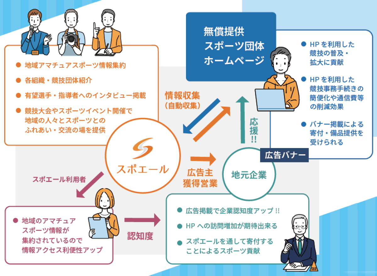 スポエールは社会貢献性のとても高い、地域のアマチュアスポーツ団体や競技者、応援する企業・組織、スポエール利用者の全員がWin/Winになれる。そんなプロジェクトです。